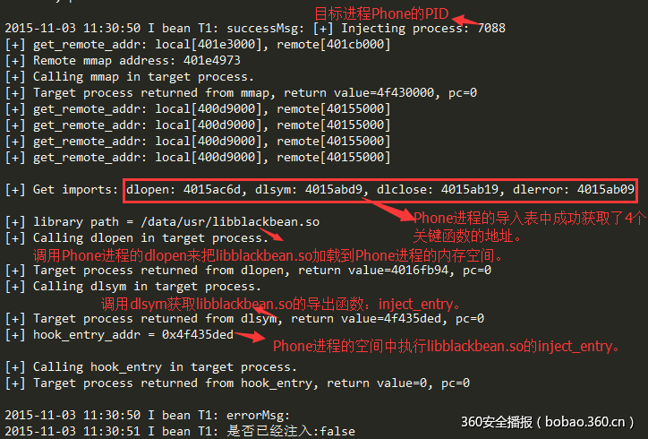 libblackbean.so的inect_entry导出函数被执行后,调用JNI_CreateJavaVM加载redbean.dex.jar,并且调用redbean.dex.jar中com.android.phone.os.Program的Main函数。以此整个注入过程结束,下图为注入过程相关运行日志。