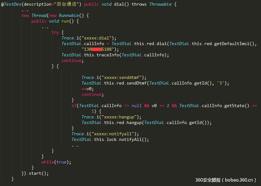 后台通话功能可以在后台给某特定电话号码拨号。在测试程序中发现了木马作者用作测试用的手机号,该手机号是否为木马作者本人还无法确定。