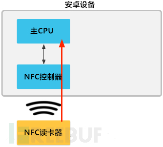 【基于主机的卡仿真(HCE)】:当采用安全元件提供的NFC卡仿真,被仿真的卡是通过Android应用程序配置到该设备上的SE,如图1。然后,当用户将设备放在一个NFC终端上,在设备安卓设备上的NFC控制器转发所有数据直接从读卡器到安全元件。当使用基于主机的卡仿真模拟的NFC卡,这些数据被传输到运行在安卓应用程序上的主机CPU,而不是NFC协议的帧传输到安全元件上,如图2。