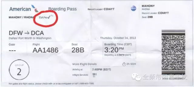 乘客将能够在登机牌的乘客姓名栏附近看到起预先通知作用的“TSAPRECHK”或“TSA Pre✓”的提示字样。在移动登机牌上,TSA Pre-Check标识将出现在条形码上方的右上角。请注意,如果符合TSA Pre-Check资格,无论航班的起飞机场是否设有预检通道,旅客整个行程的所有登机牌上均将显示此标识,如下图所示的美国航空公司登机牌。