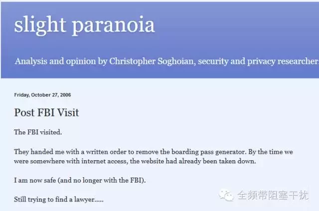 在网站运行一周后,接到举报的FBI探员直接破门而入,在家中实施了逮捕。虽然Soghoian最终获得保释,但该网站在被FBI和TSA警告后已经彻底封掉。如下图,博客中还清晰地记录着从FBI出来的那个日子……可怜的guys。
