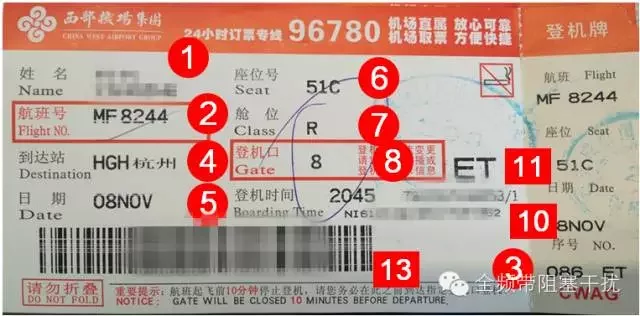 目前国内航空公司在使用的登机牌,其票面结构基本如下图所示: