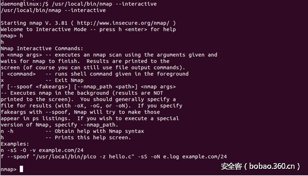 nmap支持“interactive.”选项,用户能够通过该选项执行shell命令,通常,安全人员会使用该命令来避免他们使用nmap命令被记录在history文件中