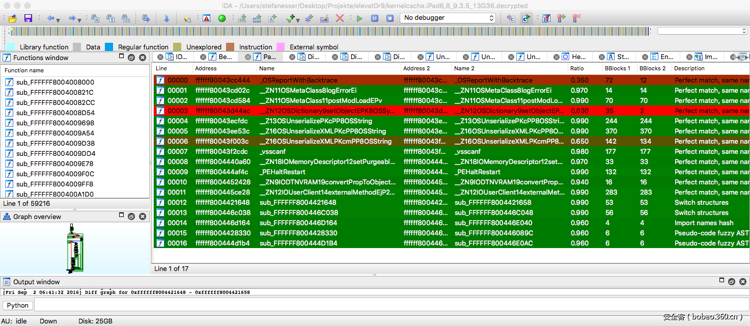 转储出两个内核后,我们需要分析它们的差异。我们使用IDA中的开源二进制diffing插件Diaphora来完成这个任务,为了进行比较,我们将iOS 9.3.4内核加载到了IDA,然后等待自动分析完成,然后运用Diaphora将当前IDA数据库以同样的格式转储到SQLITE数据库。对于iOS 9.3.5内核,我们重复了一次这个过程,然后命令Diaphora比较两个数据库的差异。比较的结果可在以下的画面中看到: