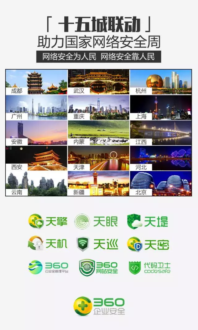 360将在国家网络安全宣传周活动中登陆武汉、成都、杭州、广州、重庆、上海、安徽、内蒙、江西、西安、天津、河北、云南、新疆等十多个城市,以及国税总局在京组织的网络安全宣传周活动。在各地网络安全宣传周活动中,360将分别通过网络透明人、威胁地图、伪基站、特洛伊木码、黑客改号等生动的形式向全国各地用户和观众普及网络安全知识。