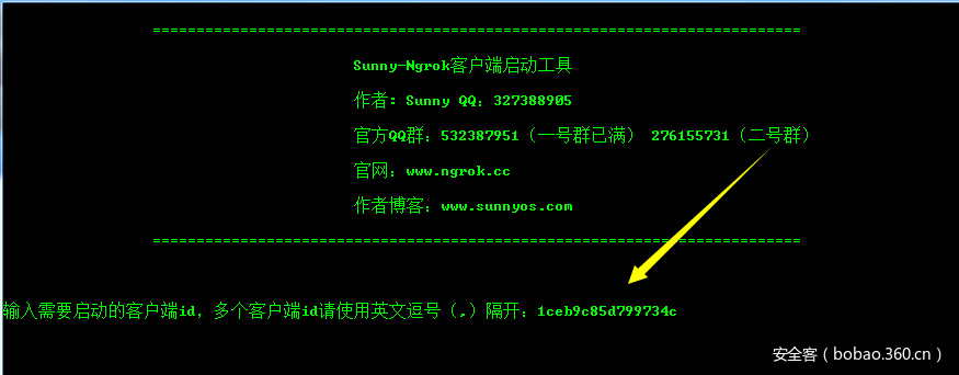 这次是在windows上面启动ngrok,所以选择相应的版本,先执行《Sunny-Ngrok启动工具.bat》,再输入客户端id: