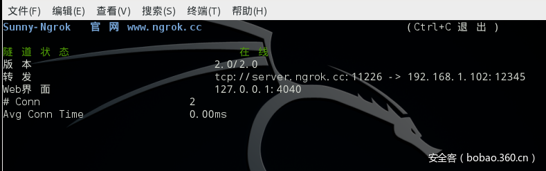 这里实现的是由外网的端口转发到内网的12345端口当中:server.ngrok.cc(119.28.62.35):11226->192.168.1.102(kali的ip):12345.