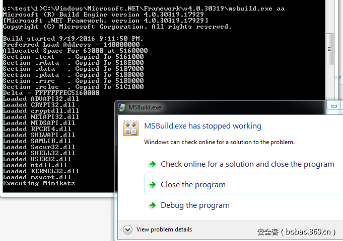 对照上文提到的xml格式,编写代码实现在Inline Tasks中内存加载64位的mimikatz.exe,实现代码的下载地址为: