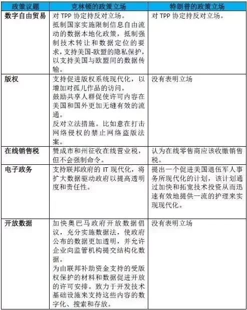 其次,在价值立场来看,克林顿崇尚自由开放的政策倾向,同时强调国家安全和隐私保护的平衡,包括鼓励数字贸易,积极吸纳全球优秀人才等,鼓励数据全球自由流动方面的政策立场十分明确。特朗普由于其鲜明的保守主义倾向,导致海外科技人才引进方面持消极立场,且在和希拉里的政策呈现鲜明对比。
