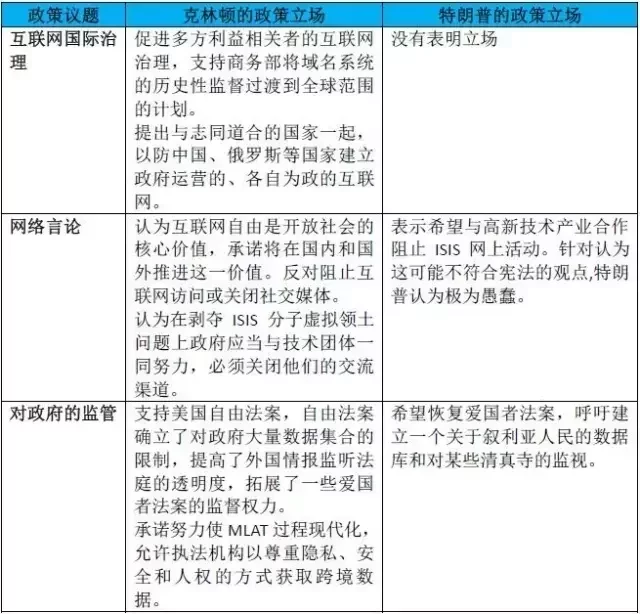此外,在维护国家安全方面,两位竞选人都表达出对严厉打击ISIS等恐怖主义的鲜明姿态。相对来说,克林顿更强调政府与企业和国际社会的合作,共同应对网络安全威胁;特朗普则强调安全优先的导向,提出强化国家情报监控能力和威慑能力,用网络战打击恐怖主义,包括对商业企业的加密威胁国家安全提出担忧。