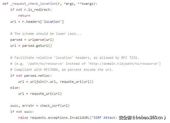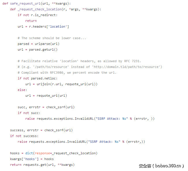我们可以考虑一下,我们将检查SSRF的过程也写为一个hook函数,然后传给requests.get,在之后的请求中一旦获取response就会调用我们的hook函数。这样,即使我设置allow_redirects=True,requests在每次请求后都会调用一次hook函数,在hook函数里我只需检查一下response.headers['location']即可。