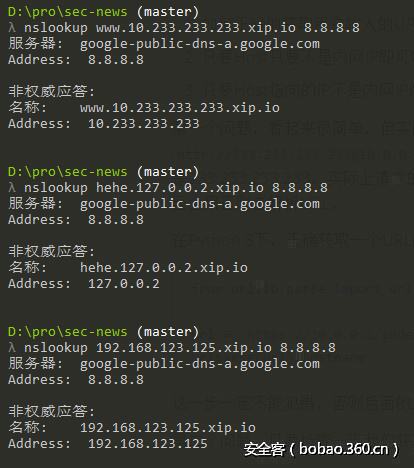 这个域名极大的方便了我们进行SSRF漏洞的测试,当我们请求http://127.0.0.1.xip.io/info.php的时候,表面上请求的Host是127.0.0.1.xip.io,此时执行is_inner_ipaddress('127.0.0.1.xip.io')是不会返回True的。但实际上请求的却是127.0.0.1,这是一个标准的内网IP。