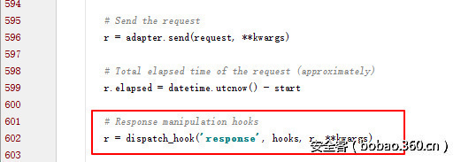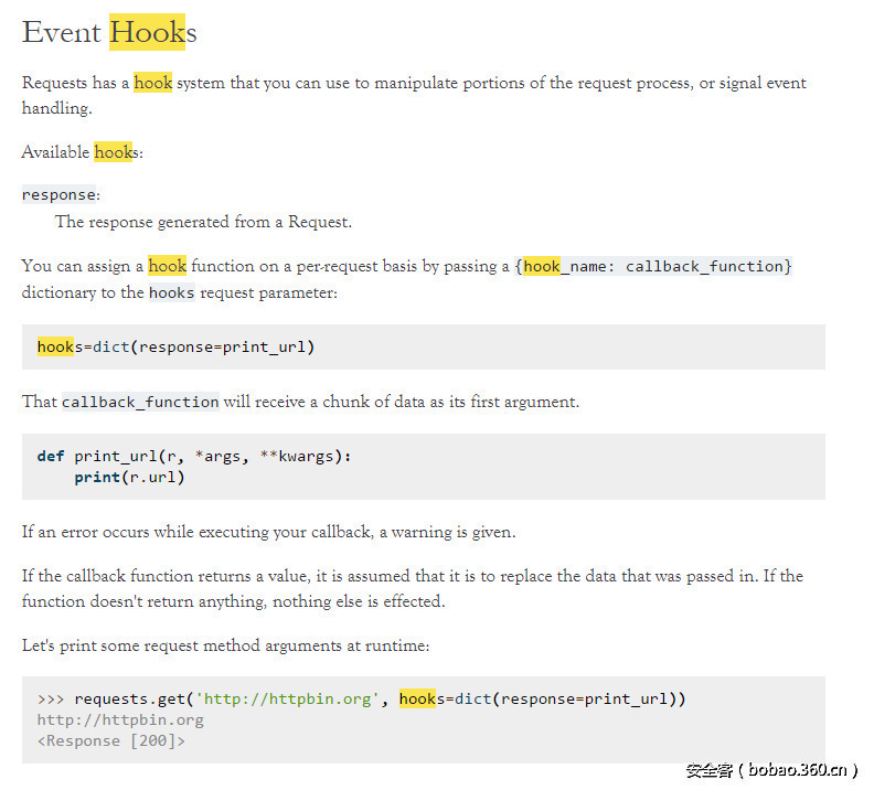 我们翻翻文档,可以找到hooks event的说明 http://docs.python-requests.org/en/master/user/advanced/?highlight=hook#event-hooks :
