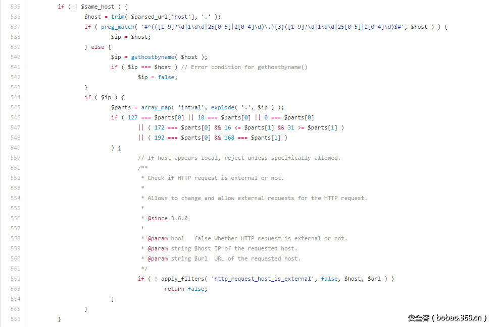 更聪明一点的人是不会用正则表达式来检测IP的(也许这类人并不知道内网IP的正则该怎么写)。Wordpress的做法是,先将IP地址规范化,然后用“.”将其分割成数组parts,然后根据parts[0]和parts[1]的取值来判断: