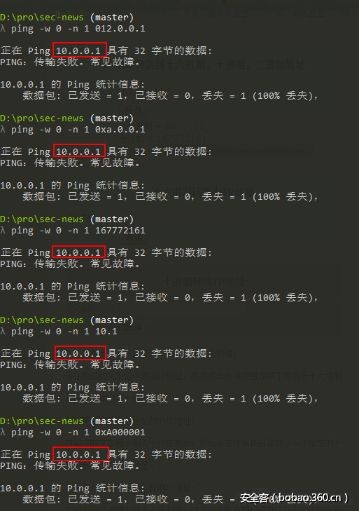 四种写法(5个例子):012.0.0.1 、 0xa.0.0.1 、 167772161 、 10.1 、 0xA000001 实际上都请求的是10.0.0.1,但他们一个都匹配不上上述正则表达式。