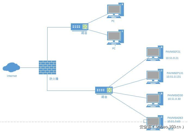 此次渗透的环境:假设我们现在已经渗透了一台服务器PAVMSEF21,该服务器内网IP为10.51.0.21。经过扫描,内网网络结构大概如下图所示。其中我们控制的服务器是连接外网和内网的关键节点,内网其他服务器均不能直接连接。图还是我老婆画的,越来越漂亮了!: )