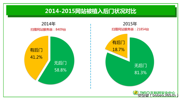 由于特殊原因本次《报告》未统计网站后门情况,为了让大家更完整的了解网站安全威胁情况,我们翻出了2015年的《中国网站安全报告》来参考。从2015年的《报告》中可以看出很大比例的网站被黑客留下了后门程序,这些后门程序主要包括ASP木马、JSP木马、PHP木马、一句话木马等WebShell木马后门,攻击者可以通过木马后门控制网站服务器甚至可以以网站服务器为跳板继续对内部网络进行渗透入侵。