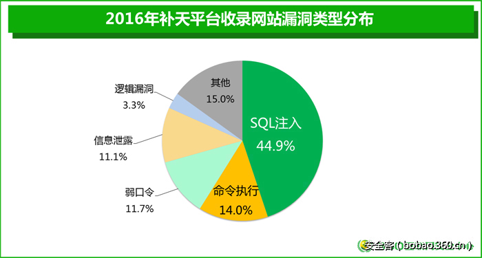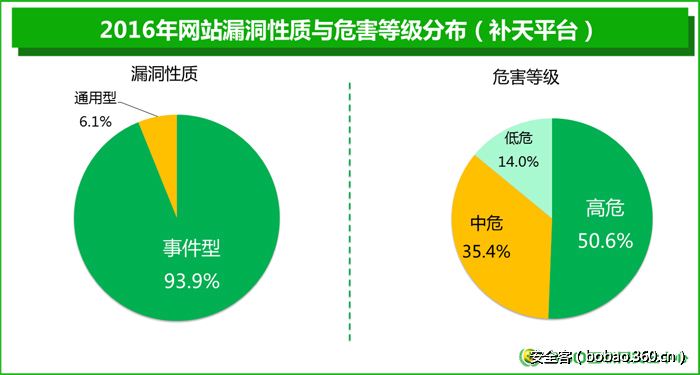 网站有漏洞说明网站有一定的安全威胁,而如果网站漏洞可以被利用并造成有效攻击那后果就比较严重了。2016年全国白帽子提交到补天平台的37188个漏洞中93.9%的漏洞是事件型漏洞,是网站漏洞可以被有效利用甚至被入侵的过程性案例事件。360补天平台的漏洞统计对网站管理员来讲具有重要的借鉴参考价值。
