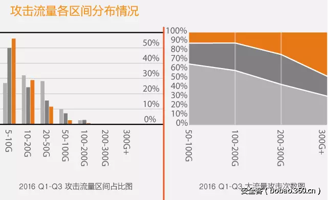 我们找了另外一家知名抗DDOS厂商最近发布的DDOS报告供大家参考,我们可以从防护的角度来看DDOS攻击。从下图的统计中发现百分九十以上的大流量DDOS攻击低于50G,而高于100G的DDOS攻击寥寥无几。