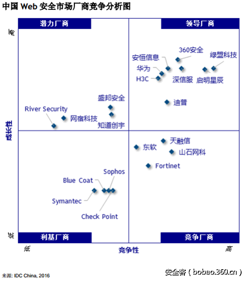 360利用其在网站安全技术和安全数据方面的积累出品的网站SaaS化云安全产品已经商用两年,并持续为政府、高校、教育、金融、企业、运营商等各个行业用户的网站持续的提供安全防护及监测服务。正是360在基于 SaaS 模式的 web 安全防护及监测方面的优异表现,2016年IDC在《中国 Web 应用安全市场洞察》市场《报告》中将360列入领导者象限。
