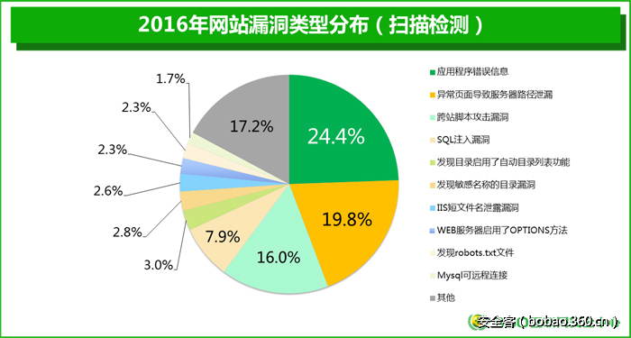 网站漏洞的分布情况如下图所示,其中应用程序错误信息漏洞、异常页面导致的服务器路径泄露漏洞和跨站脚本攻击漏洞占据很大比例。