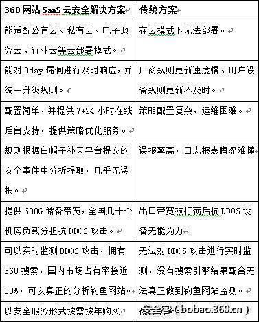 传统的网站安全方案中以抗DDOS+防火墙+IPS+WAF为核心防护设备,以漏洞扫描器、网站监控平台等设备进行安全监测。360网站SaaS云安全解决方案和传统方案相比有着较大的优势,对比如下图: