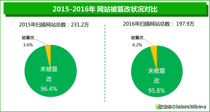 在对197.9万个网站的监测数据中发现4.2%的网站遭到了恶意篡改,主要是页面图片或页面内容的篡改,而有些网站被插入了色情类或博彩类的链接,或者直接在网站代码中插入暗链。