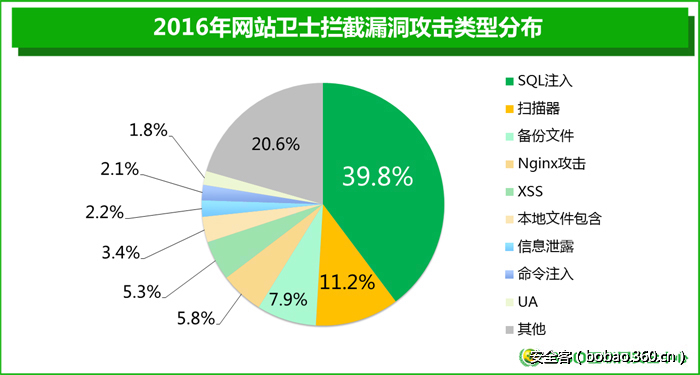 360网站云防护系统现已接入全国66万个一级域名和150万个网站域名,一级域名数量占CNNIC统计中国备案网站域名数量450万个的15%,是全国最大的网站安全防护系统。以下是360云防护系统的漏洞拦截分布情况,从分布图中可见SQL注入攻击在网站攻击方式中占据很大比例,其次是扫描器的扫描攻击。