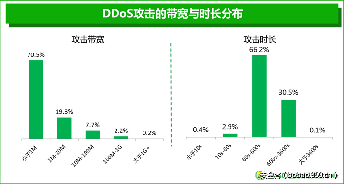 如果网站有漏洞则网站就有被入侵的风险,而如果无论网站有没有漏洞我都要打你,这就有点耍流氓了,DDOS攻击就是这样。《报告》给出的DDOS攻击流量分布和带宽分布着实让人挠头,因为其70%的DDOS攻击流量竟然小于1Mb,这和我们脑海里的大流量的洪水猛兽式的流量攻击好像不太相符,这是基于攻击技术特征而不是基于流量大小和攻击结果标准划分的结果,是从监测技术的角度看DDOS攻击。