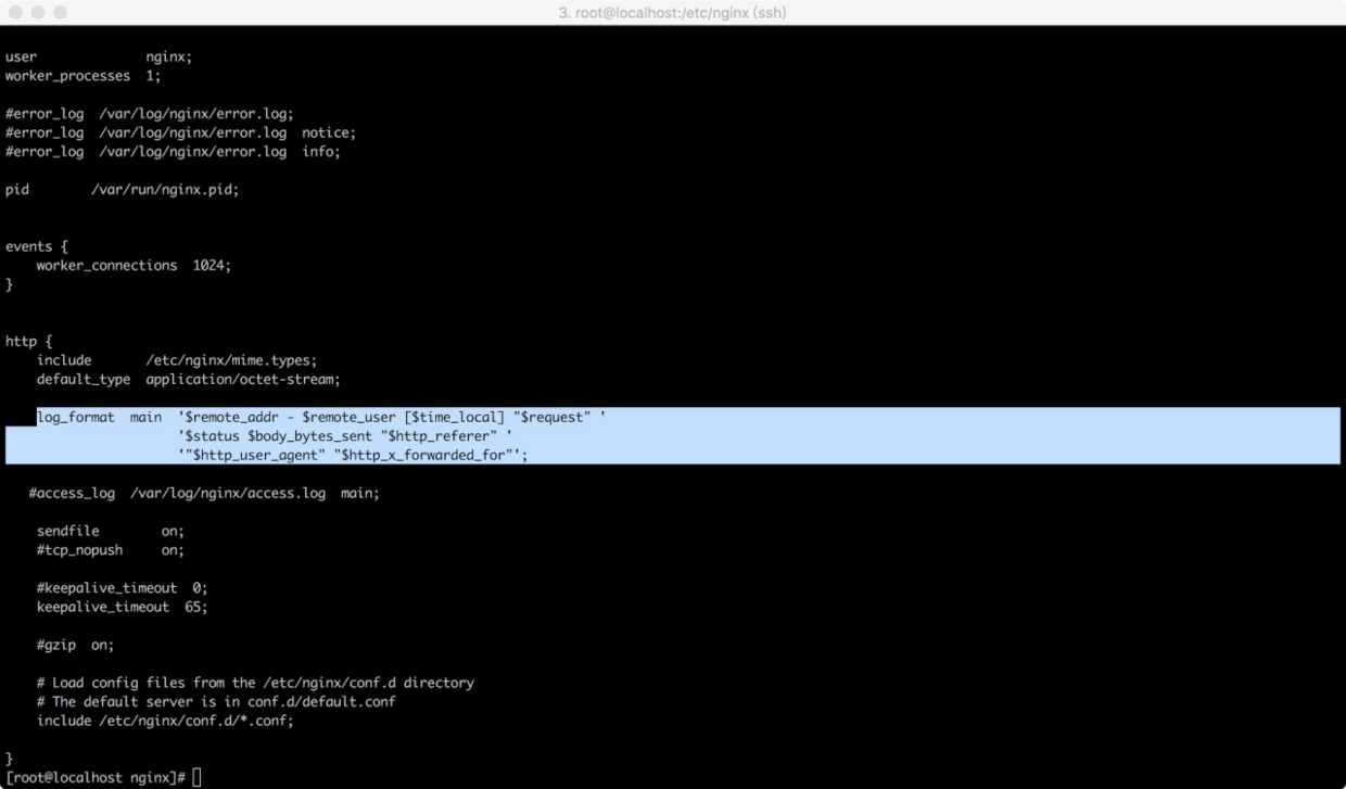 remote_addr - remote_user [time_local] "request" 'status body_bytes_sent "http_referer" 'http_user_agent" "$http_x_forwarded_for"';