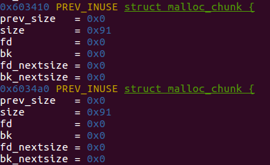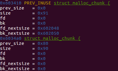 如果我们正常地free掉了chunk0的话,chunk1的presize应该是0x90,但是这里被我们修改为了0x80.
