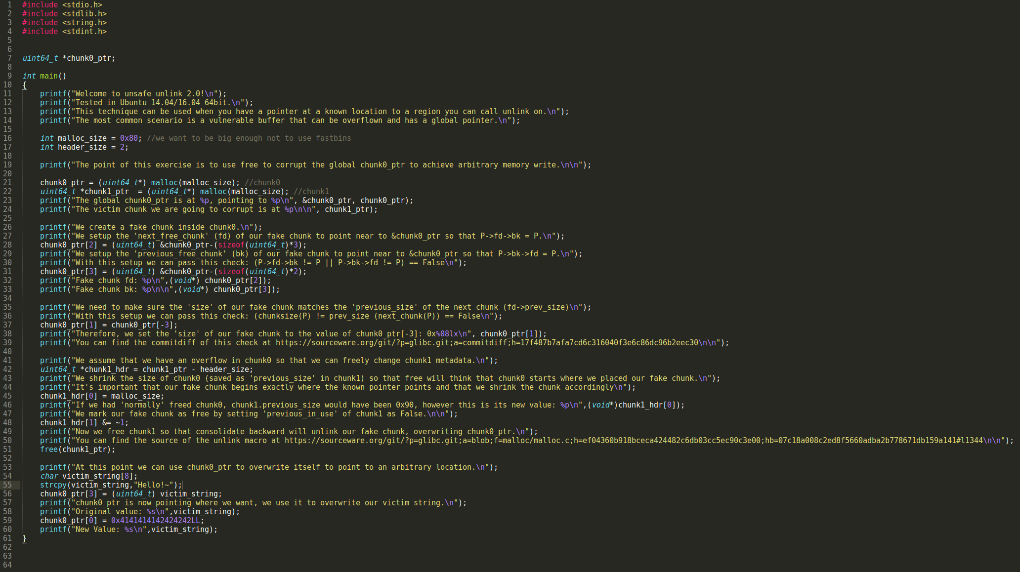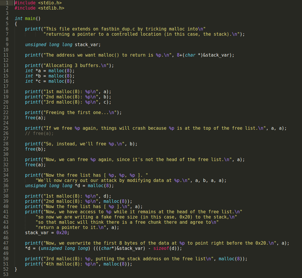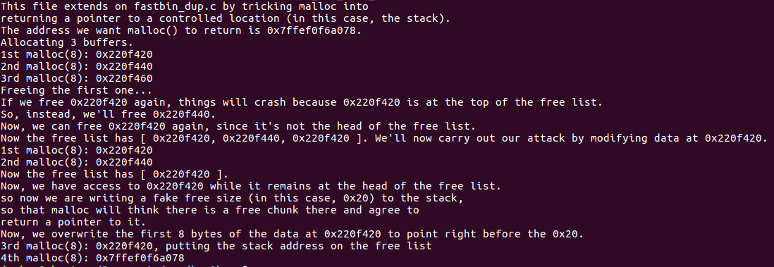 这个程序更具体地展示了上一个程序所介绍的技巧,通过欺骗malloc来返回一个我们可控的区域的指针(在这个例子中,我们可以返回一个栈指针)
