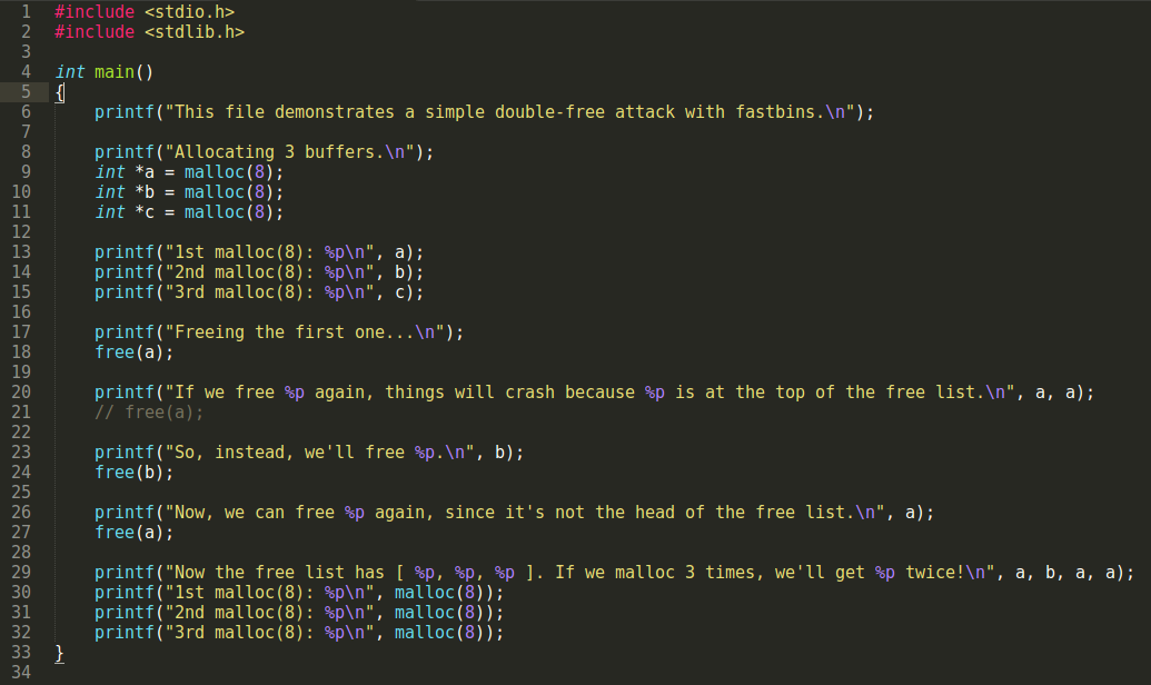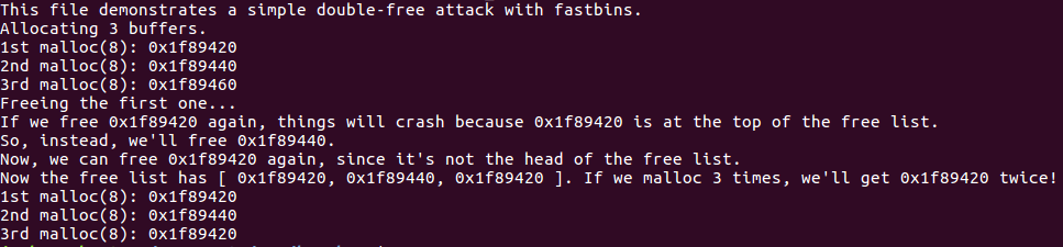 这个程序展示了一个利用fastbin进行的double-free攻击. 攻击比较简单.