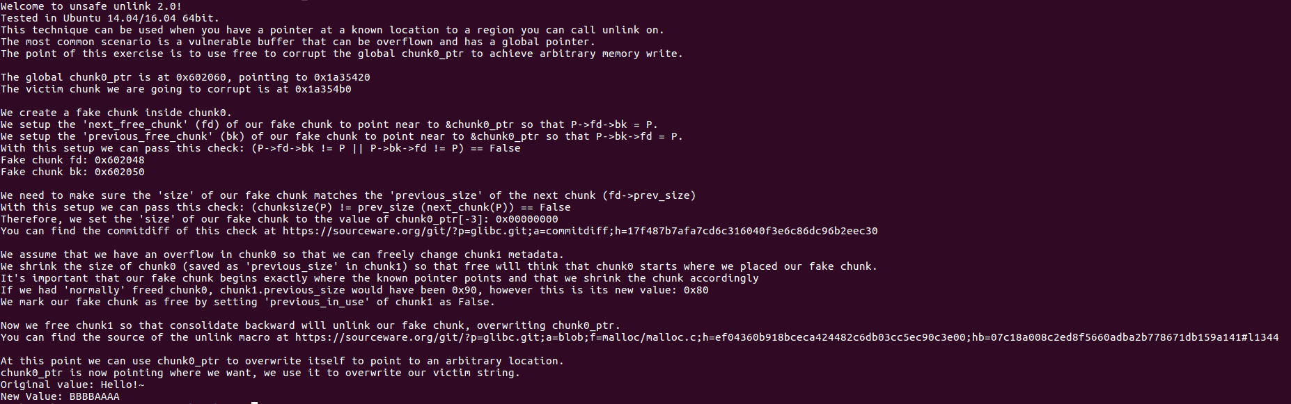 这个练习的关键在于利用free()来改写全局指针chunk0_ptr以达到任意地址写入的目的.
