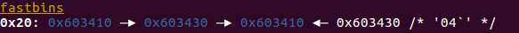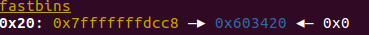 也许有人会有疑问,为什么链表上还会多出来一个地址? 那是因为我们伪造的堆块的fd指针位置刚好是这个地址的值.可以查看一下内存: