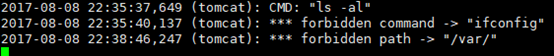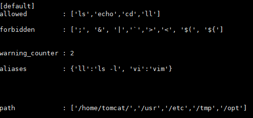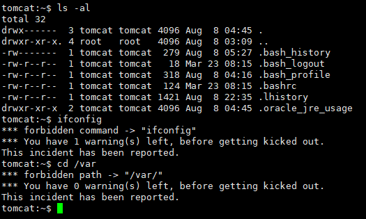 配置如上图所示,只允许使用的命令为:ls、echo、cd、ll,只允许访问的路径为/home/tomcat/、/usr、/etc、/tmp、/opt。 在受限shell下进行操作,可以看到不允许的操作被禁止。