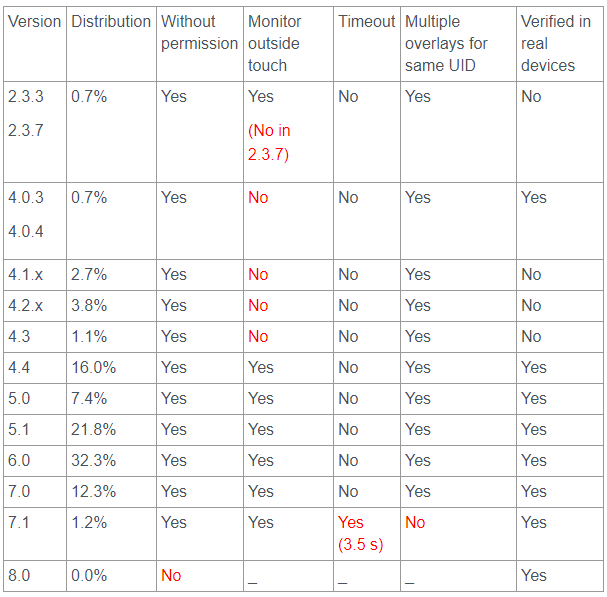 Palo Alto Networks公司Unit 42实验室研究人员在Android overlay系统中发现一个高危漏洞,它允许使用"Toast类型"叠加层,可以发起新型的Android overlay攻击。所有OS版本<8.0的Android设备都受到这个漏洞的影响,在2017年9月份Android安全公告中发布了该漏洞的补丁。Android 8.0版本刚刚发布,不受此漏洞的影响。正因为Android 8.0刚刚发布,所以这个漏洞几乎影响到目前市面上所有的Android设备(见表1),用户应尽快更新补丁。
