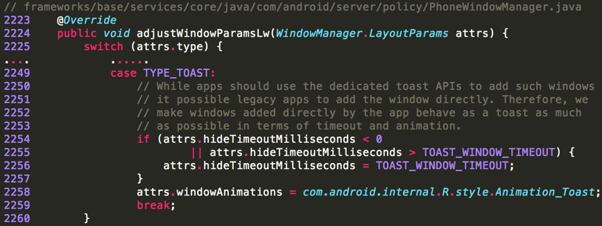 此漏洞是由于缺少权限检查造成的。在Android的AOSP相关代码段(版本<= 7)中可以看到,是如图2所示。通常,将窗口覆盖在其他应用程序的顶部需要进行权限检查和操作检查。然而,在TYPE_TOAST案例中,那些检查并不到位。请求将自动被授予。根据图2中的注释,该应用程序将被授予对TYPE_TOAST窗口的完全控制权。