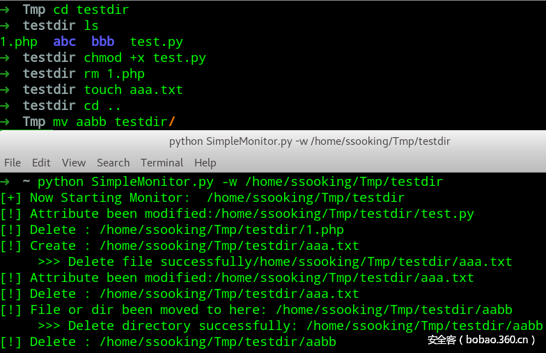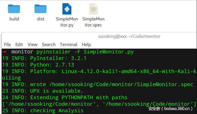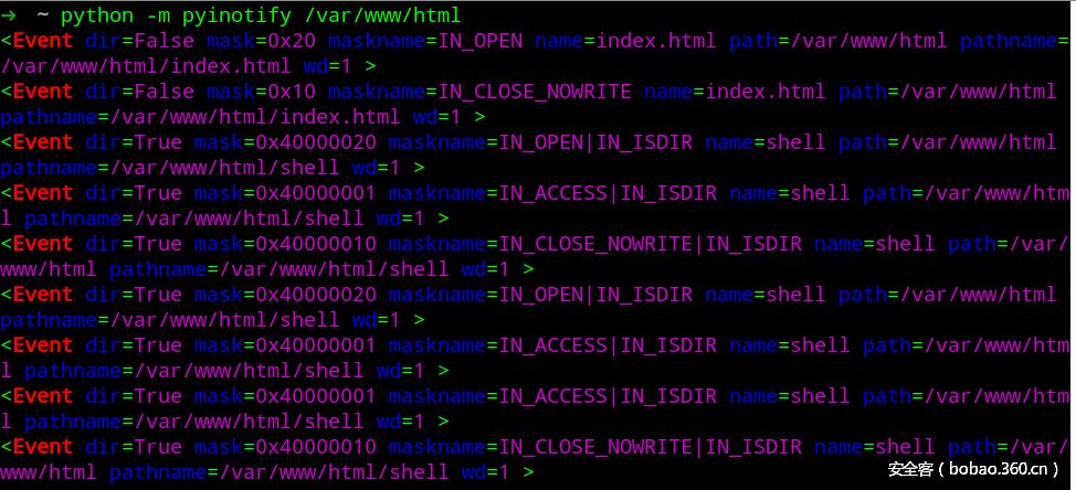 python的第三方库pyinotify可以让我们很方便地实现这些功能。但是由于是第三方库,线下赛中通常没法联网安装库,所以我们可以手工把库文件传到靶机里python库中: /usr/lib/pythonXXX/site-packages,但是更方便的做法是借用pyinstaller等工具将其打包成linux可执行文件。