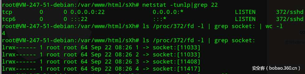 比如我们查看ssh进程的socket连接。如果我们检测的程序有socket连接,说明它正在进行网络通信,我们就需要进行进一步判断。