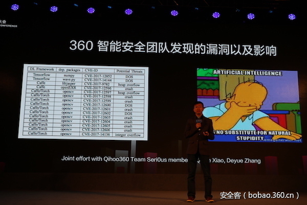 通过分析常用的深度学习框架软件实现,360 安全团队在2017年夏天发现并公布了多个安全漏洞,涉及到的深度学习框架包括Caffe,TensorFlow,Torch等。 这些漏洞会导致多种对深度学习应用的威胁,包括拒绝服务攻击,逃逸攻击,以及通过深度学习系统漏洞来实现远程劫持。 此次演讲将现场展示这些深度学习框架中的安全隐患,目的是提醒公众在期待人工智能应用的同时关注人工智能系统实现的安全问题。