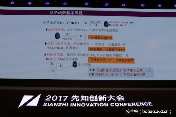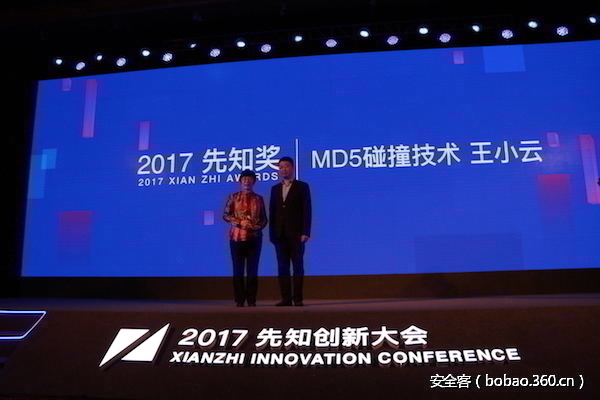 获奖者是研发MD5技术的中国密码专家,清华大学“杨振宁讲座教授”王小云博士。她在讲台上分享了自己对于哈希函数的理解以及对MD5碰撞技术的研究。王小云博士对中国安全学术和产业界的发展具有颠覆性贡献。 密码学领域最权威的两大刊物Eurocrypto与Crypto将2005年度最佳论文奖授予了这位中国女性。媒体称她为“十年破解了五部顶级密码的女天才”。