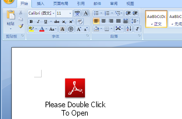 通过分析P.O# 62826-D.docx文档,发现文档中既没有利用漏洞也未嵌入宏,而是直接在文档中嵌入PE 恶意文件。打开文档后显示如下所示内容,提示用户双击打开(Please Double Click To Open),并且该程序伪装成正常的Adobe PDF文件图标,普通用户会以为是正常的文档内容,从而双击打开该程序。