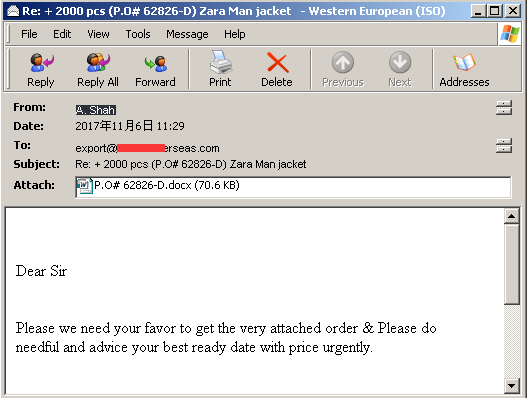 如下是一起在文档中嵌入带毒程序进行鱼叉邮件攻击的案例,其中邮件主题是P.O(Purchase Order采购订单)类,邮件内容大致是请给出附件订单中产品的最优价格,邮件附件名为“P.O# 62826-D.docx”,很多用户在收到此类邮件时,发现发件人使用的是专用的企业邮箱,并且看到该邮件内容、主题以及附件名称,会以为是正常的客户请求,从而打开附件。