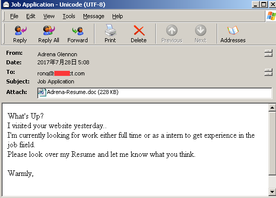 如下是一起利用恶意宏文档进行鱼叉邮件攻击的案例,其中邮件主题为Job Application(工作申请),邮件内容大致是攻击者伪装成自己经验与该工作比较契合,麻烦查看简历,邮件附件名为“Adrena简历”。很多用户在看到该邮件内容、主题以及附件名称,会以为是正常的工作申请,从而打开简历中招。