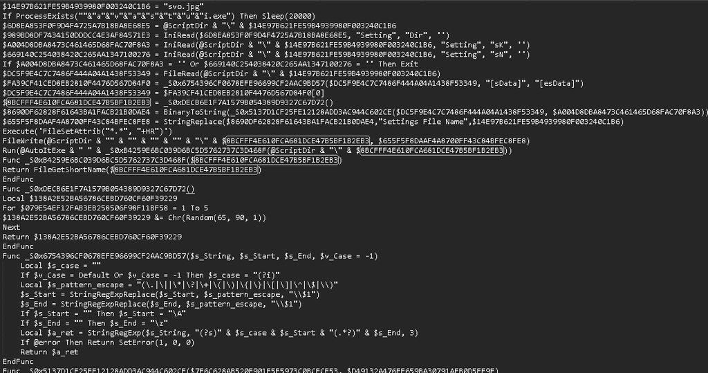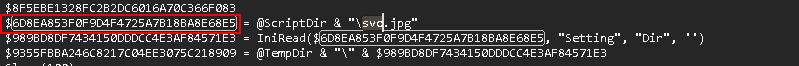 脚本会设置目录文件为隐藏和只读属性,然后会去读取svo.jpg中的二进制数据,解密出另一个脚本,并生成长度为五的随机大写字符串作为新的文件名。