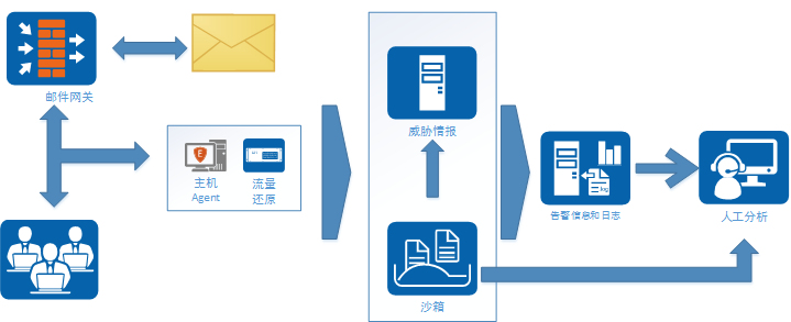 钓鱼邮件攻击的威胁检测主要立足于建立一套针对邮件威胁场景的安全运营流程,对外部投递的电子邮件进行威胁检测和有效拦截。首先,通过在邮件网络入口部署邮件网关型产品,通过定义规则对已知钓鱼邮件进行过滤,包括纯粹通过社工手段收集账号密码的场景或已知可查杀的恶意附件样本都依靠邮件网关规则和特征进行拦截;对已经绕过邮件网关检测规则和样本查杀的威胁检测,结合威胁情报技术和沙箱技术,主要针对终端漏洞利用型钓鱼邮件的攻击检测。