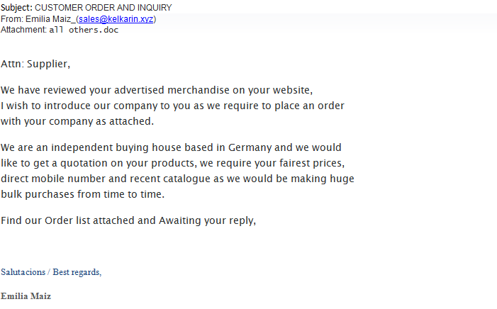 最近我们捕捉到投递到公司多个公共邮箱的带有邮件附件电子邮件告警,邮件的内容描述的是一些通用的商务场景,该邮件绕过了公司邮件网关的查杀,邮件威胁检测对该邮件的附件判定为高风险,威胁情报判定为高风险,接受到邮件时通过virustotal查询只有有限的杀软厂商检测到该附件为恶意样本,沙箱行为检测结果也显示该邮件附件有诸多危险行为。