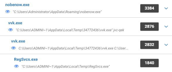 漏洞触发后,访问https:[//]longstop[.]club/avatars/gues/lnd[.]php, 并下载名称为 nobenow.exe的PE文件,然后在本地执行。漏洞触发后的进程树如下图所示: