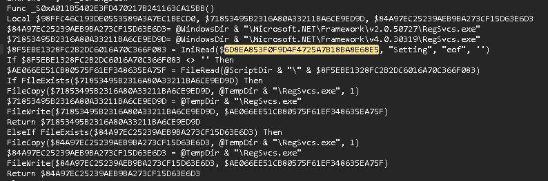 QRIFT是新生成的恶意脚本。这个脚本同样是被混淆过的,且变量名等信息做了散列。这段脚本的行为是读取”\Microsoft.NET\Framework\v2.0.50727\RegSvcs.exe”,并将该文件赋复制到临时目录下,然后附加svo.jpg的一段数据到RegSvcs.exe的末尾。